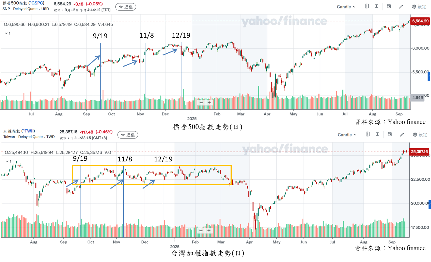 觀察去年9月至12月降息前後的美股(S&P500指數)與台股(台灣加權指數)走勢,在降息前,S&P500指數有明顯的一小段上漲趨勢,並在降息後持續上漲,其中9月與11月的降息皆在降息當天創歷史新高,12月的降息則是在今年1、2月創歷史新高;此次降息前,S&P500指數從今年4月的最低點一路反彈,6月底至今持續創新高,並且在9月初就業報告出爐時,疲軟的就業市場讓市場更加篤定聯準會降息,截至9/12的月報酬上升1.92%,有機會扭轉9月股市下跌的魔咒。台灣加權指數跟隨美股的趨勢,同樣在上漲前皆有漲勢,但皆未創歷史新高,且台股在去年9月至今年2月處在盤整區間,相對美股而言,缺少上漲的動能,直到3月,外資大幅賣超,開始跌破盤整的箱型區間,並在4月跌至最低點,但在5、6月的大幅反彈下,台股在8月中創歷史新高;在今年聯準會降息前,台股9月截至9/12的月報酬已大幅上漲5.12%,遠超過S&P500指數的漲幅。由於此次降息前,美股與台股都在創新高,股市已先反應市場對降息帶來的資金寬鬆效果,預期短期股市會有高檔獲利了結的賣壓,但長期而言則會延續歷史經驗,有機會迎來新一波的上漲週期。