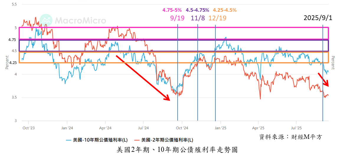 聯準會主要受到就業市場與通膨指標決定是否降息,近期美國公布8月的就業數據,都顯示美國就業市場有降溫的現象,小非農的ADP就業報告顯示8月民間就業人數僅增加5.4萬人,遠低於市場預期6.8萬人的低標,官方統計局的非農就業報告也顯示,8月非農就業人數僅增加2.2萬人,遠低於市場預期7.5萬人,失業率更上升至4.3%,再者,美國統計局更下修截至今年3月過去一年以來的非農就業人數91.1萬人,是歷年來最大下修規模,更加說明就業市場早已疲軟。8月的通膨數據則相對較能控制,8月的PPI月減0.1%,遠低於市場預期上升0.3%,年增2.6%也低於市場預期的3.3%,顯示生產者的通膨壓力下降,儘管關稅戰使生產成本上升,但目前轉嫁至消費端仍有限,強化市場對聯準會的降息預期,而8月的CPI年增2.9%,雖然仍高於2%的警戒線,但符合預期,不影響9月的利率決策。