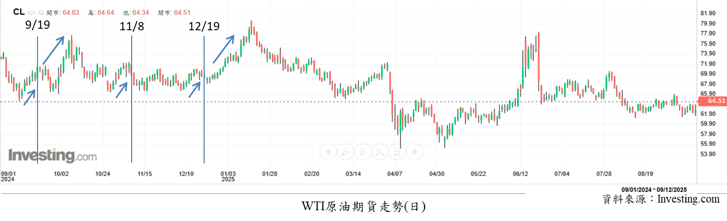 美國降息對大宗商品的影響,從原油與黃金來看,理論上皆是利多消息。在油價來看,石油的價格因素受到市場供需、全球經濟等多方的影響,降息僅是其中的影響因素之一,如果假設其他因素不變,僅看降息對油價的影響,由於降息會降低資金的借貸成本,促進經濟活絡,市場對原油的需求上升,油價就會跟著上升,降息對於油價屬利多消息;但實際上仍受其他變數影響,去年三次的降息中,在降息前WTI原油期貨皆有預期降息前的漲勢,降息後,僅有9月與12月WTI原油期貨有明顯的漲勢;然而,目前的石油狀況仍受OPEC+的增產政策與中國大陸的原油需求疲軟,導致供過於求的現象,自今年4月起,OPEC+開始增加每日的石油產量,從4月每日小幅增產13.8萬桶,擴大到9月每日增產54.7萬桶,以捍衛其成員國的市佔率,儘管最新10月決議每日增產下降至13.7萬桶,但川普仍訴求油價處在下緣以壓低整體通膨率,預期至今年年底,原油需求仍低於供給,整體油價仍處偏弱格局,故預期降息對油價的激勵程度有限,今年以來截至9/12, WTI原油期貨已下跌12%,呈現疲弱的走勢。