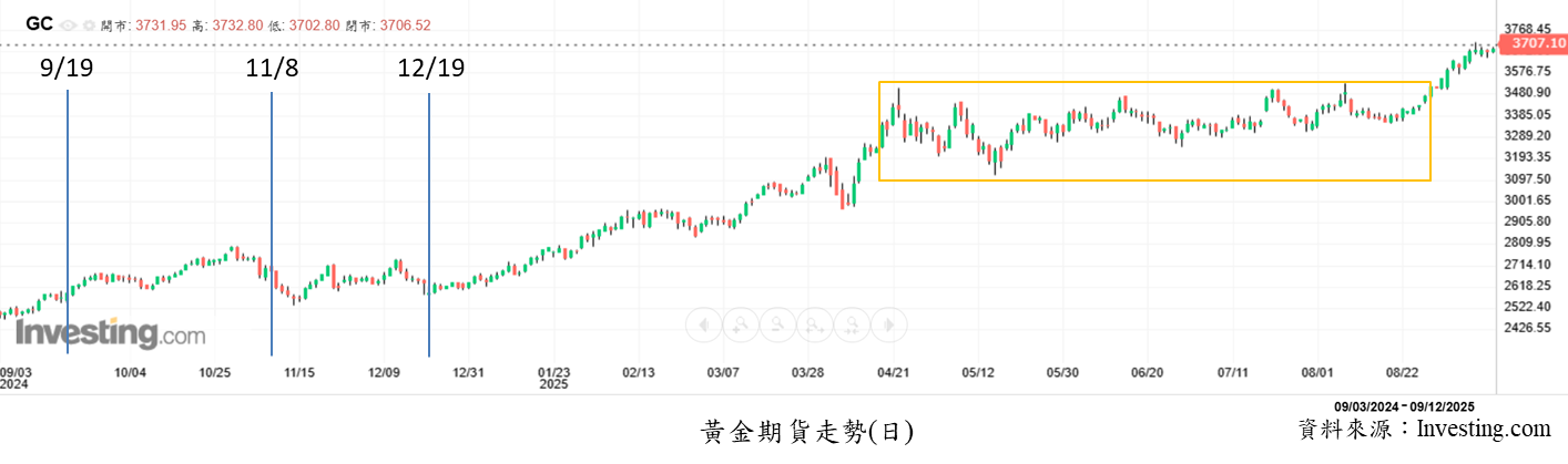 降息對金價的影響會因為美元走貶,吸引投資人將資金轉為持有黃金以保持購買力,且降息代表經濟景氣的轉弱,推高市場對黃金的避險需求,進而使金價上漲,在去年的三次降息,黃金期貨在降息前與降息後皆逐步走高,上次12月降息後,黃金期貨的價格持續上漲至今年4月初,在今年4月中至8月出現盤整期,而在9月初的就業數據出爐後,市場更加確立對聯準會的降息預期,金價在9月升破盤整格局,並延續去年逐步創新高的走勢;另外,推升金價創新高的原因,除了降息,另一大部分是各國央行近年對黃金需求的買盤,降低對美債的儲備並提升具保值性的黃金,也是推升金價創高的主要原因。