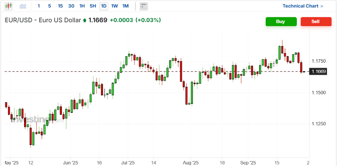 本週歐元兌美元在區間震盪中走勢偏弱,上周一度觸及約 1.1919 的四年高點後,收盤回落至約 1.1750 附近。主要受美國強勁經濟數據提振美元走勢,對歐元形成壓力。基本面上,歐元區的企業活動雖有回升跡象,9 月份綜合 PMI 重返擴張區間,顯示經濟仍有韌性。同時,歐元區銀行放款成長亦見改善,有助支持內需信心。但與此同時,歐盟內部政治風險與外部美元強勢形成兩大拖累。技術面來看,歐元若無法持穩 1.1750 支撐,可能進一步向下測試 1.1700 區域支撐;若美元回軟,反彈空間則可挑戰 1.1820、1.1880 等阻力。總體而言,本週歐元表現受美元強勢與歐元區經濟數據交互影響,短線需密切關注美國經濟表現、聯準會動向與歐元區政治風險變化。