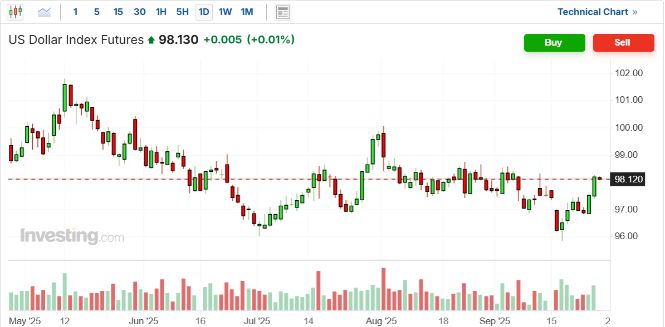 本週美元走勢偏強,主要受到美國公佈的經濟數據優於預期與市場對聯準會(Fed)降息空間重新評估的影響。 特別是第二季 GDP 被上修至 3.8%,遠高於先前預估,使得市場傾向認為 Fed 在短期內可能更為謹慎,降低降息幅度或延後時點。同時,美元指數(DXY)本週上漲逾 0.5 %,對歐元、日圓等主要貨幣構成壓力。 債券市場方面,長期公債殖利率也出現上揚,反映市場對貨幣政策仍有不確定性。此外,儘管 Fed 已進行 25 個基點降息,但官員對進一步降息的態度分歧,使美元仍具有避險屬性。 展望下週,將關鍵觀察 PCE 通膨數據、就業報告、以及 Fed 官員言論是否進一步暗示利率路徑調整。 若通膨持續強勢,美元有可能延續強勢格局;反之,若經濟放緩使降息預期升溫,美元可能轉為震盪或修正。