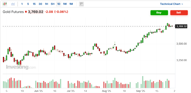 本週黃金期貨整體呈現?勢整理格局,投資人既看重避險需求,也在利率與美元走勢間試圖消化方向。根據路透報導,黃金連續第五週上漲,主要受聯準會暗示未來有降息空間所支撐。此外,儘管美元在部分交易日因美國強勁經濟數據回升,黃金價格仍穩守高位,因地緣政治與通膨風險使其具備「避險資產」屬性。技術面來看,黃金期貨目前維持於高檔區域震盪,若未能突破近期阻力,短線仍可能出現小幅回調。根據 Investing.com 的走勢報告,若價格跌破 3,765 美元╱盎司,將可能加速調整動能。展望後市,關鍵在於美國的通膨數據(尤其 PCE 指數)與就業報告能否支撐市場預期的貨幣政策鬆動。如果通膨回落、經濟動能放緩,市場對降息的預期可能重燃,黃金有望續漲;若數據強勁、美元反彈,則黃金可能承壓。