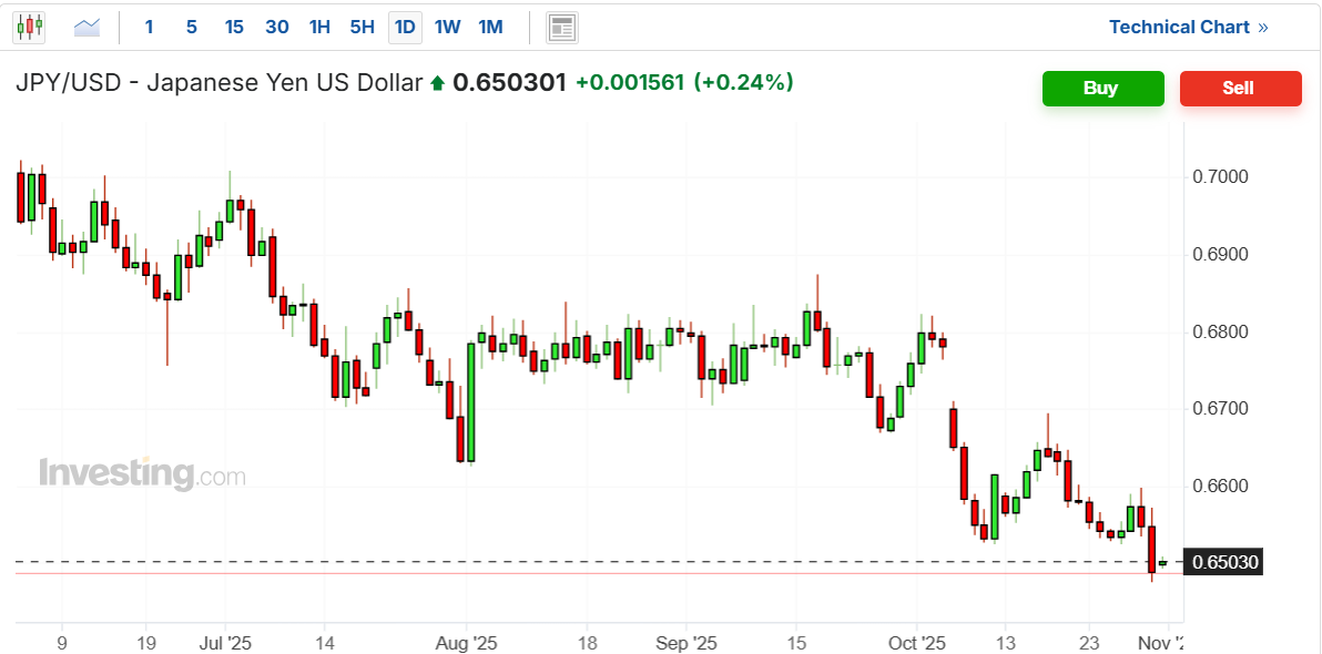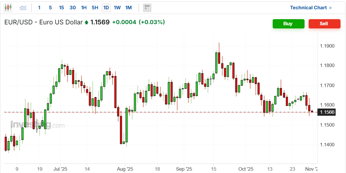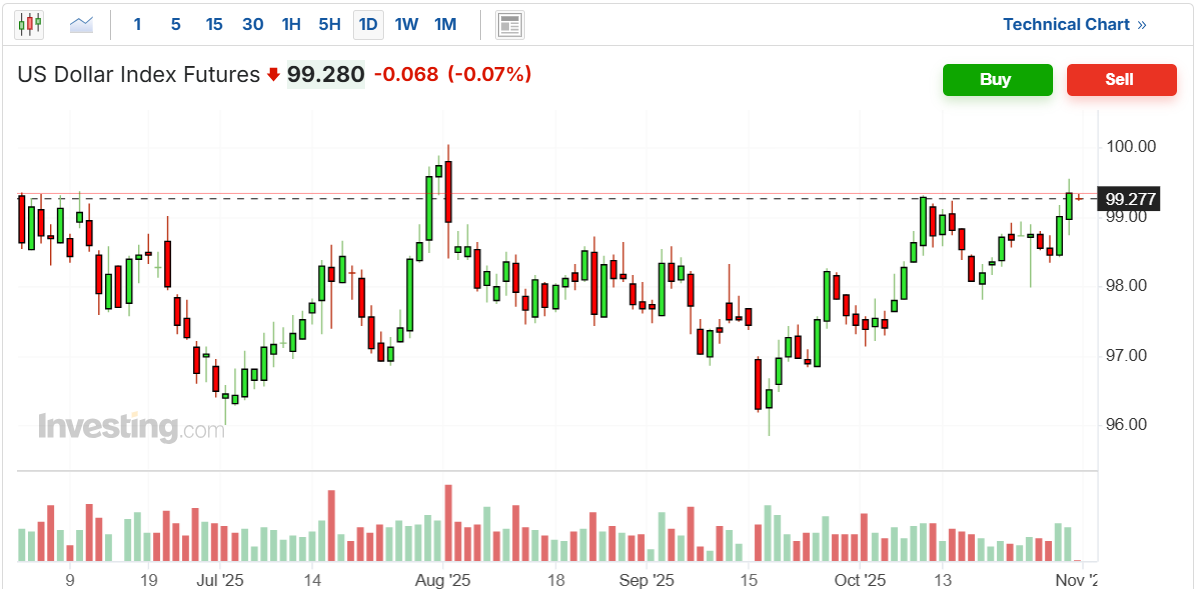 本週美元指數呈現高檔震盪走勢,投資人聚焦於美聯準會(Fed)利率決策與最新經濟數據。Fed 如預期調降利率 25 個基點至 3.75–4.00%,主席鮑威爾表示未來政策仍將依據通膨與就業數據靈活調整,市場解讀為「溫和鴿派」。消息公布後,美元短線走弱,但隨後受避險需求及美債殖利率反彈支撐,跌幅有限。整體而言,美元在多空因素交織下維持於105附近區間震盪。展望後市,若接下來的就業與通膨數據持續顯示放緩,美元可能進一步修正;但若美國經濟展現韌性或地緣政治風險升溫,避險需求將再次推升美元走強。短期內美元仍具波動性,市場方向將取決於利率預期的再平衡。