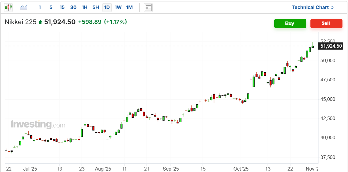 本週亞洲股市整體走勢分歧,市場情緒在中國經濟數據改善與地緣政治不確定性之間拉鋸。區域指數整體維持震盪偏強,資金回流主要集中於科技與出口導向板塊。中國方面,官方製造業 PMI 重回擴張區間,顯示景氣有初步回穩跡象;加上政策面持續釋出支持措施,包括地方政府再融資債發行與房地產融資鬆綁,帶動滬深兩市連續反彈。港股則受惠於內地政策利多與大型科技股回升,全週表現相對突出。然而,市場對民間消費與房地產修復的可持續性仍有疑慮,使漲勢略顯保守。日本股市在日圓貶值與企業財報支撐下持續上漲,外資買盤回流至大型出口與半導體股。不過,日本央行暗示將逐步退出超寬鬆政策,使市場對未來利率路徑保持謹慎。南韓與台灣股市則延續科技題材的強勢表現,AI、晶片與電子零組件族群帶動指數上行,但成交量略顯保守,顯示投資人仍在觀望全球利率變化。整體而言,亞洲市場短線氣氛改善,但中期仍受全球需求疲弱、美中貿易摩擦與政策轉折風險牽動。若中國經濟持續回穩、美元轉弱,亞洲新興市場資金可望進一步回流;反之,若美債殖利率再度攀升,區域股市可能再現獲利了結壓力。