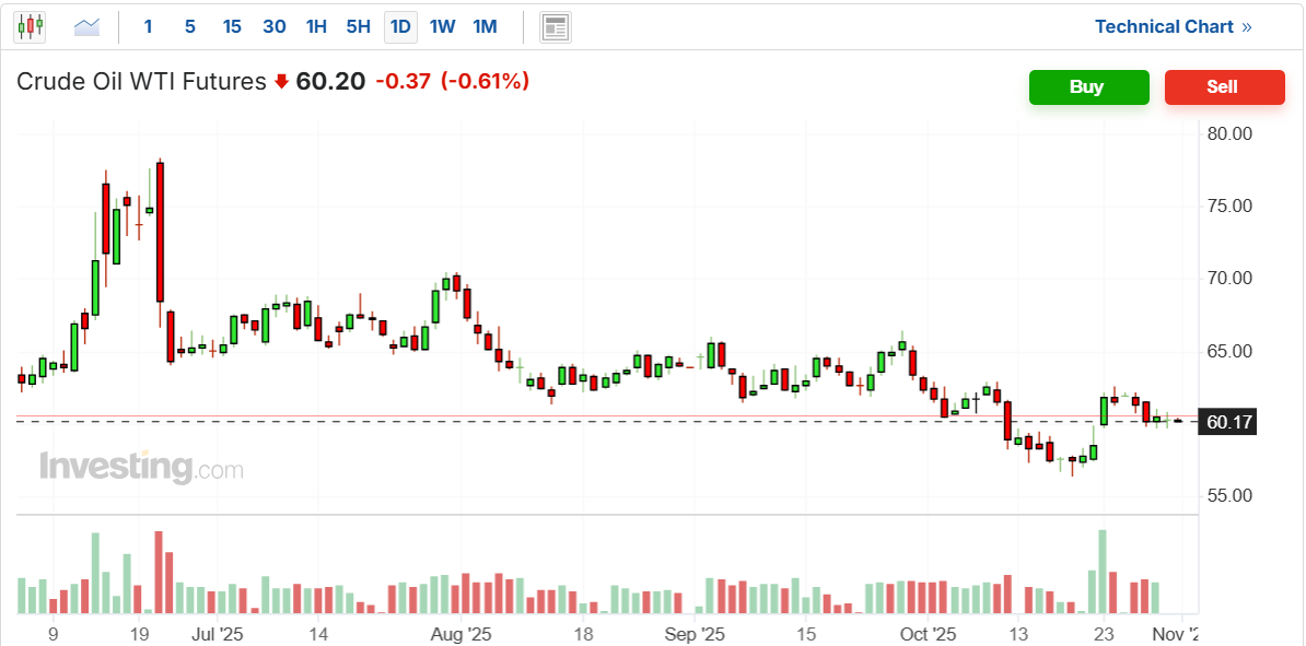本週國際原油期貨價格小幅回升,市場在供需面訊息交錯下呈現震盪走勢。原油期貨一度突破每桶62.50美元,但因美國原油庫存增加與需求成長放緩,漲幅最終收斂。美國能源資訊署(EIA)報告顯示,庫存意外上升超過400萬桶,顯示短期供應仍偏充裕,壓抑油價上行空間。另一方面,中東地緣局勢持續緊張,以及OPEC+可能延長減產協議的消息,為油價提供下檔支撐。市場預期沙烏地阿拉伯與俄羅斯將在年底前維持減產,以穩定市場平衡。此外,中國與印度進口需求略有回升,反映部分季節性補庫需求。整體而言,油價在供應受控但需求疲弱的環境下維持區間盤整。短期若美國經濟數據持續放緩,可能抑制能源需求預期;但若中東局勢惡化或OPEC+加大減產力度,油價仍有反彈空間。