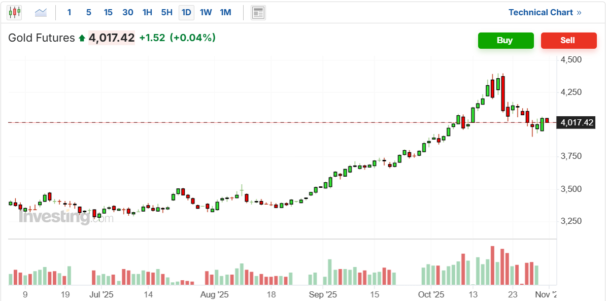 本週國際黃金期貨價格漸漸震盪走高,主要受美聯準會降息與美元走弱帶動。Fed 如市場預期調降利率 25 個基點,主席鮑威爾釋出「依數據而定」的中性訊號,推升市場對未來寬鬆周期的預期。美元指數回落、美債殖利率下降,使黃金吸引力上升,期貨價格一度突破每盎司2,420美元。此外,全球地緣政治風險與股市震盪也帶動避險買盤湧入,進一步支撐金價。亞洲及歐洲央行的溫和立場,使投資人增加對黃金等非孳息資產的配置。不過,部分獲利了結賣壓於週末浮現,限制金價上行空間。展望後市,若通膨持續放緩、主要央行維持寬鬆預期,金價有望延續多頭格局。